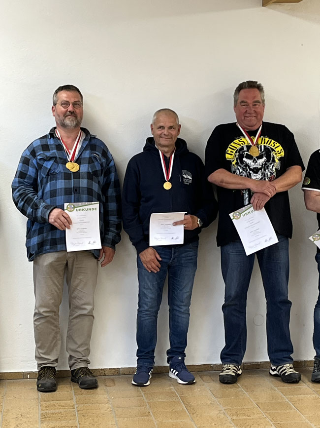 Goldmedaille in der Disziplin Perkussionsrevolver: von links nach rechts: Jörg Klock Wolfgang Riedel (Hessischer Meister 2024 in der Disziplin Perkussionsrevolver) und Hans-Michael Würdinger