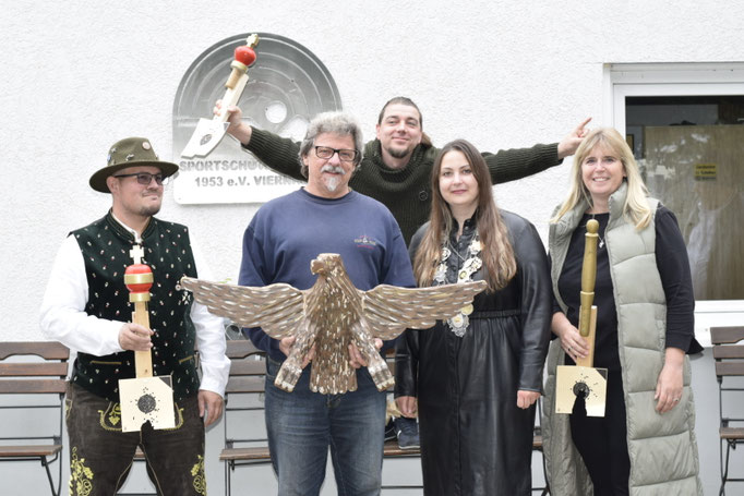 Auf dem Bild von links nach rechts: Thorsten Drogosch (2. Vorsitzender des SSV Viernheims und 2. Ritter), Alexander Weiß (Schützenkönig 2023/2024), Alexandra Mertens (Schützenkönigin 2024/2025), Katharina Meier (1. Ritter) und Wolfgang Riedel (3. Ritter).